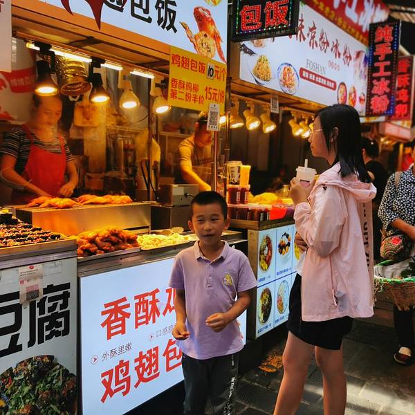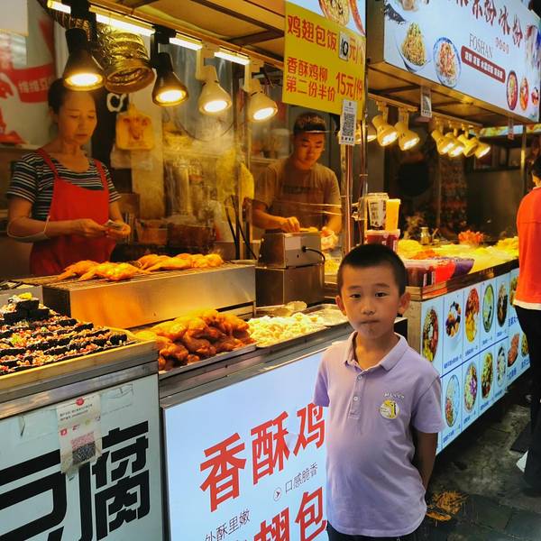 会址出来后,不远处有个周同学的店,跑进去喝奶茶。周同学出来,返回几十米有一个捞沙巷,一家接一家的小食,吸引了孩子们的目光。