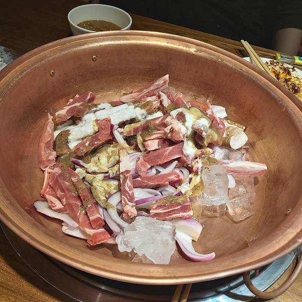 冰煮羊肉的冰是泉水,肉放在冰上,开火冰化了煮羊肉,开锅后半小时羊肉变软,吃完肉后涮菜。牛羊肉是这里的特色,两个人140左右。烤包子不错,肉馅满满,趁热吃脆皮的~烤羊小腿35,烤的香脆,肉不多好吃~大块儿羊肉串8块冰煮羊肉