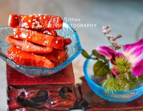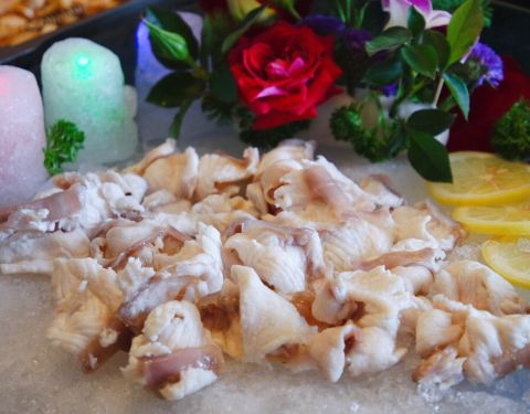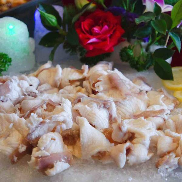 冰镇鲨鱼,用鲨鱼做刺身还是头回吃,鱼肉紧实口感弹牙,带皮也更具嚼头胶质感满满,搭配特制蘸料风味十足。