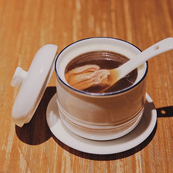 - 小肠汤打成这样的结并不是为了造型,而是口感。加入了酒糟元素的五花肉,糯烂入味。非常真实