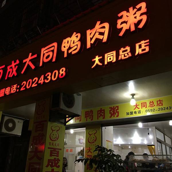 鼓浪屿回来到了中山路,搜了下附近有这家百成大同鸭肉粥,也经常在美食攻略上看到,其实店面挺小的差点错过,先点单买单,阿姨很忙碌的在烧粥,加料的食材也都在外面。 点了小份粥,加了鸭肉鸭珍豆干油条,也要15...鼓浪屿回来到了中山路,搜了下附近有这家百成大同鸭肉粥,也经常在美食攻略上看到,其实店面挺小的差点错过,先点单买单,阿姨很忙碌的在烧粥,加料的食材也都在外面。 点了小份粥,加了鸭肉鸭珍豆干油条,也要15块了不算便宜,因为这个粥不是熬的而是现烧的,会觉得有点像泡饭,粥底挺鲜的,鸭子味儿蛮重的,味道其实还可以,吃了暖暖胃。