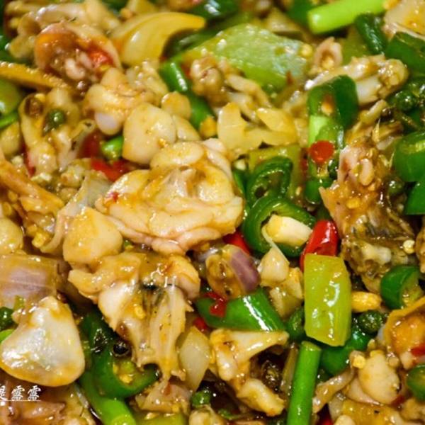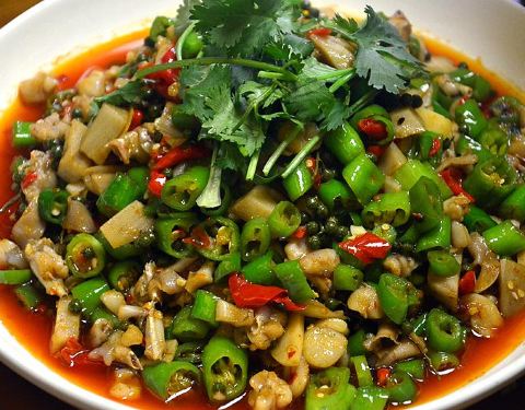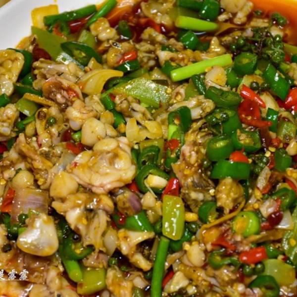 双椒牛蛙,牛蛙切成小块,搭配着辣椒、泡椒以及其他的辅助食材,在大火快炒中保持着牛蛙的细嫩肉质。