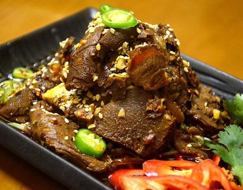 蒜泥白肉,相当考验师傅的刀工,焯过水的五花肉被片成薄厚均匀的肉片,再淋上蒜泥红油为主的酱汁,肥瘦相间的三层肉肥而不腻,蒜香味浓郁。吃一片真的不过瘾!