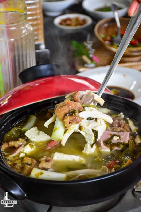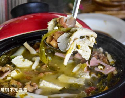 泸州荤豆花,这道菜我真的好喜欢!因为有我喜欢的抓过粉的三层肉,肥肥瘦瘦带着点筋道,豆花的味道有黄豆的豆香,还有这这道菜其他食材的味道。偷偷告诉你这个酸菜也超好吃的,我们几个人把这锅豆花吃个底朝天!
