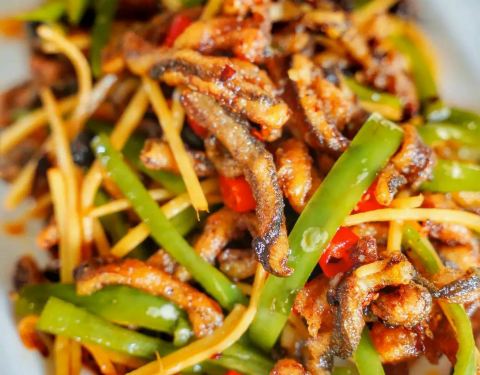 虫草花拌牛肉丝,这道菜我是吃完才看的菜名,吃的时候完全不知道是什么东西,只觉得香香脆脆还辣辣的,有点点像大家喜欢的垃圾食品辣条的味道。不过这些个食材都好健康!优质鲜虫草花,裹粉炸至金黄,再加上五香牛肉丝,吃起来超级过瘾!