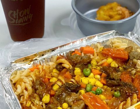 豪享来现在不仅在店内食用,也可以叫外卖,特别的方便。外卖可以点牛排、套餐饭、意大利面等,大部分选项都配了大杯的红茶。点的茄汁牛肉通心粉,相比成片的牛肉,这个牛肉的品质好得多,就是茄汁品质很一般,普通的番茄汁。