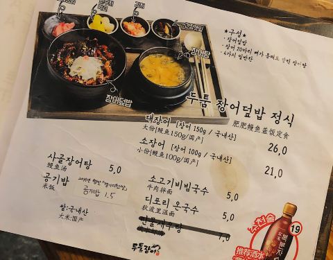 店里有烤鳗鱼和鳗鱼盖饭 韩国的鳗鱼比较贵 推荐可以点鳗鱼盖饭定食 有一个鳗鱼盖饭,一个鳗鱼汤,...