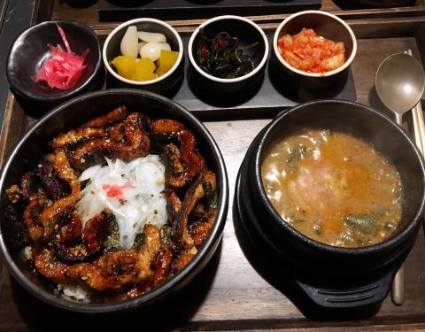 店里有烤鳗鱼和鳗鱼盖饭 韩国的鳗鱼比较贵 推荐可以点鳗鱼盖饭定食 有一个鳗鱼盖饭,一个鳗鱼汤,还有一碗米饭和各种小菜 一个人量非常足了 鳗鱼非常肥美 烤得刚刚好 一点也不腥 肉质鲜美 还有一丝丝的甜味 配着...