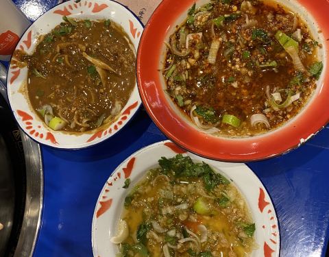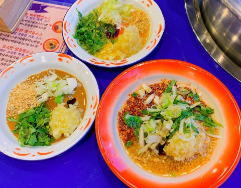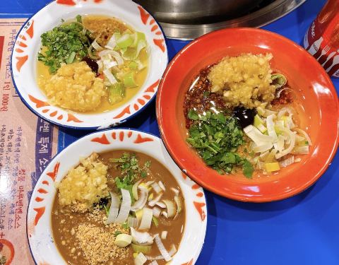 异国他乡简直治愈灵魂 味道和国内串串香差不多! 店里小姐姐会超级耐心帮你调酱料,有三种可以选择! 不知道怎么选择的我…小姐姐帮我调了三种 价格在明洞这个商圈真的不算贵了 我们点了鸳鸯锅 串串一串记得是400块 炒面很好吃
