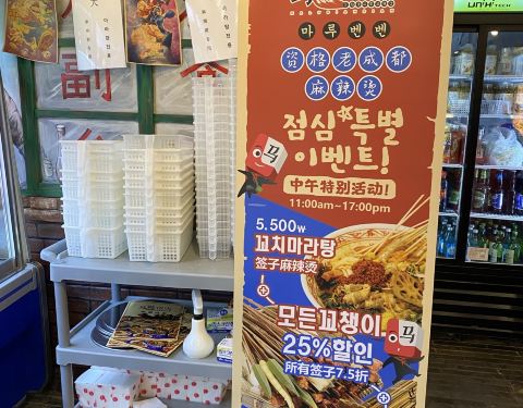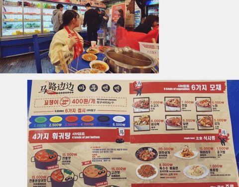 每次去明洞都会去吃各种美食 上次去的时候我发现了一家串串店~马路边边 店里风格是那种文艺怀旧风 他家有小火锅。还有麻辣烫。还有炒面 味道都超级棒 价钱也不贵 就是翻译韩语怪怪的~ 마루벤벤???벤벤??? 哈哈。不细想, 吃就完了~ [/cp]