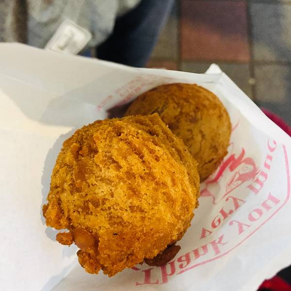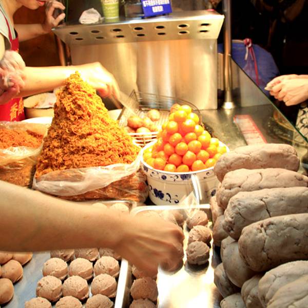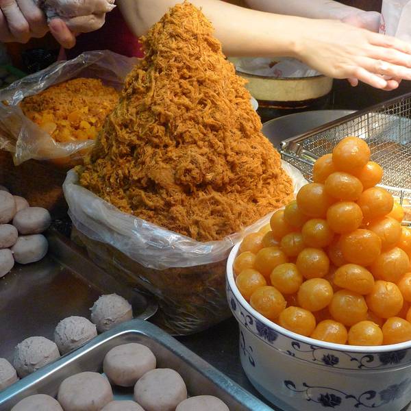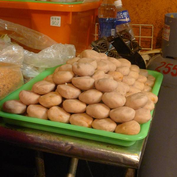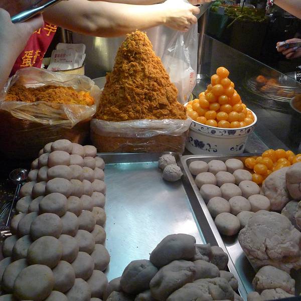 刘芋仔恐怕是宁夏夜市里最火的摊位了,要想吃到这个摊子的蛋黄芋饼和香酥芋头,不排队半小时左右是绝对吃不上的。据说所用的芋头全部来自高雄甲仙,从削皮,清洗,蒸熟到揉捏成芋泥,全部手工制作,需要花上6到7个小时。蛋黄芋饼是在芋泥里包上咸蛋黄和肉脯再下锅油炸。香酥芋丸则是用用冰激凌圆勺把纯芋泥挖成圆球下锅油炸。
