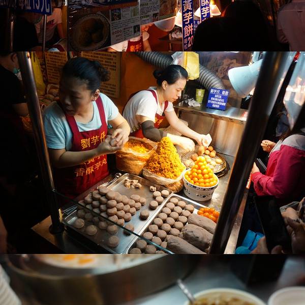 夜市最后一站,当然是这家刘芋仔,主打油炸芋丸和芋饼,还是长队理论,相信味道一定不会差。不过这家的队伍确实太恐怖了,可以从街头排到街尾,路过其他摊位时,都可以看到排这家的队伍。做芋仔的是一家四姐弟,从大芋仔球到一个个手工揉成的小球,也不知道一天要做多少个。姐弟齐心,分工明确,撑起这一个摊位。第一次来台湾时,因为时间原因,被这长到离谱的队伍给吓到了,就没吃上。这次特地预留了时间,留了胃,今晚势必要拿下几个。终于就要排到了,好激动,拍照留念,因为队伍太长,人太多,等排到了,只能派代表上前购买,这样也是为了不让队伍排出夜市街区。所以刘芋仔到底有多好吃呢?让我们现场采访一位食客。 问:请问这位小姐,这个炸芋球到底有多好吃?值得排这么长的队伍嘛? 答:自从吃了这家的芋圆,腰不酸了,腿不疼了,一口气还能爬个象山,不费劲儿。等会,让我先吃口再说,排的累死了。 嘴硬的领导,干啃了几个芋圆仔,脸上的表情早已出卖了她。