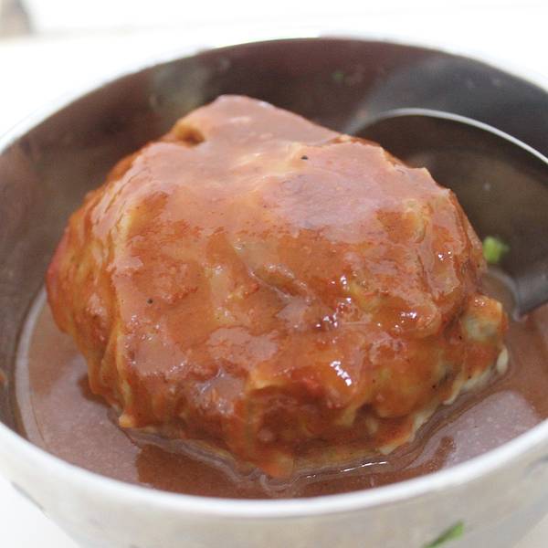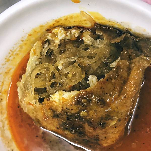 来到老街本想找老牌阿给,无奈老街啊阿给真的好多家,无所谓了,随便走进一家,没准有惊喜呢。第一次吃也无法评判随意走进的这家味道正宗与否。阿给,是在手工油豆腐中塞入炒过的冬粉,浸泡过卤汁,再去蒸熟。端上桌前淋上店家的秘制辣酱。