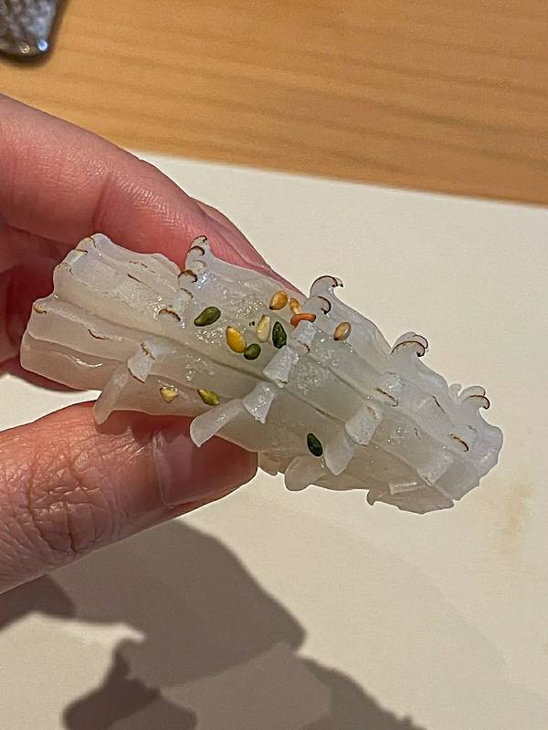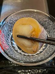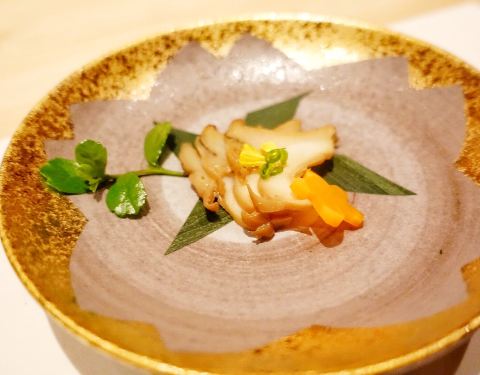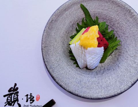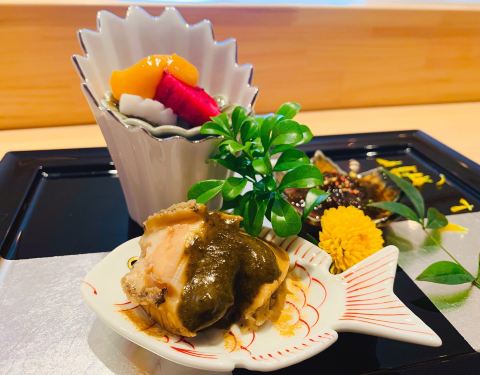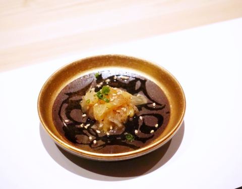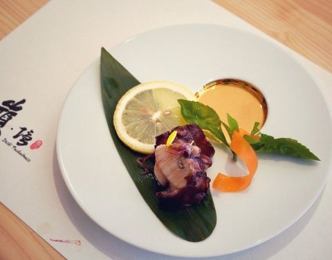 - 🦑八寸:淋鲍鱼肝酱旳鲍鱼、海发菜、淋蛋黄醋旳枪鱿鱼~主厨现调旳酱汁十分惊艳,与新鲜食材相得益彰