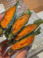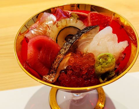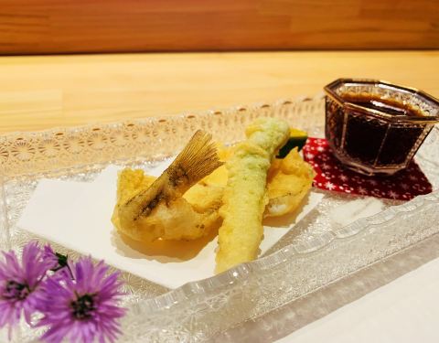 刺身的选材上,没有选择大家日常吃的三文鱼刺身,而是选择了肉质细腻肥美的「金目鲷」,口感爽脆的「真鲷鱼」很大胆的搭配菊花花瓣做点缀,肉质细腻的「金枪鱼背部」,微微炙烤依旧鲜嫩无比的「秋刀鱼」,鱼皮的光泽度明显能感受食材的新鲜程度,「象拔蚌」的鲜甜大家都懂,「贝类裙边」的鲜脆,我倒是第一次品尝。