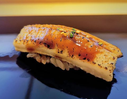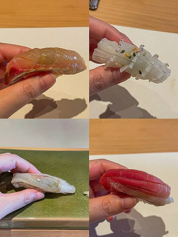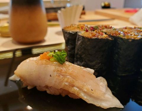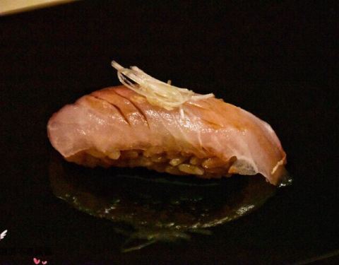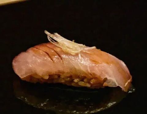 寿司巅·隐位于美丽的咖啡一条街筼筜路的别墅三楼,搭乘电梯上楼,入门的瞬间颇有一种大隐于市的幽静。有包厢,有大堂,装修风格依旧是原木色的日系风。 【刺身】 刺身的选材上,没有选择大家日常吃的三文鱼刺身,而是选择了肉质细腻肥美的「金目鲷」,口感爽脆的「真鲷鱼」很大胆的搭配菊花花瓣做点缀,肉质细腻的「金枪鱼背部」,微微炙烤依旧鲜嫩无比的「秋刀鱼」,鱼皮的光泽度明显能感受食材的新鲜程度,「象拔蚌」的鲜甜大家都懂,「贝类裙边」的鲜脆,我倒是第一次品尝。 【热菜】 「鰤鱼下巴」这道菜的火候把握的非常到位,鱼皮被烤制的金黄。不咸不淡,没有过多的调味,一切来的恰到好处。会吃的人都知道,鱼下巴的肉最是鲜嫩,高温的烤制,迅速烤酥了鱼皮,也在最关键的时刻把汁水锁住,保持鱼肉的鲜嫩多汁。 【手握寿司】 「大竹荚鱼」&「金枪鱼中腹」&「比目鱼寿司」 这个是最能考验寿司师傅功力的时候,三款寿司吃下来,感觉技术还是不错的。三款寿司的做法不太一样,但不需要我们蘸取酱油芥末了,直接擦擦手拿起寿司放到嘴里一尝就好。为了能够更好的品尝三款手握的不同,每吃完一贯寿司,我们会吃片姜片唤醒在美味中沉醉的味蕾。
