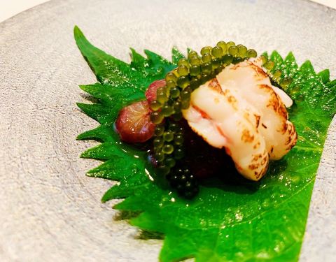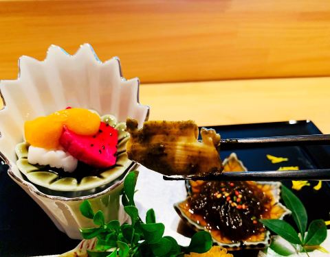 🦑八寸:淋鲍鱼肝酱旳鲍鱼、海发菜、淋蛋黄醋旳枪鱿鱼~主厨现调旳酱汁十分惊艳,与新鲜食材相得益彰