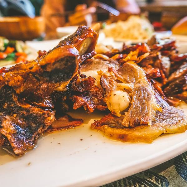 (偷偷说觉得他们家的锅茶我和小伙伴们都觉得有点淡 刚开始和小王一起作为奶茶星球人信誓旦旦点了大锅和小叶立下一定能喝完的flag 但后来发现这么大锅根本喝不完嘛TAT)咸奶茶加上炒米 感受一下牧民的日常生活倒是值得一试的事情烤牛肉肠软糯糯的 不推荐 导致后来一直没敢在俄罗斯餐厅点烤肠。。。大块羊肉和洋葱 汤汁忽少忽多 内蒙的羊肉倒是真的一点都没有膻味 值得尝试 但并不合我口味