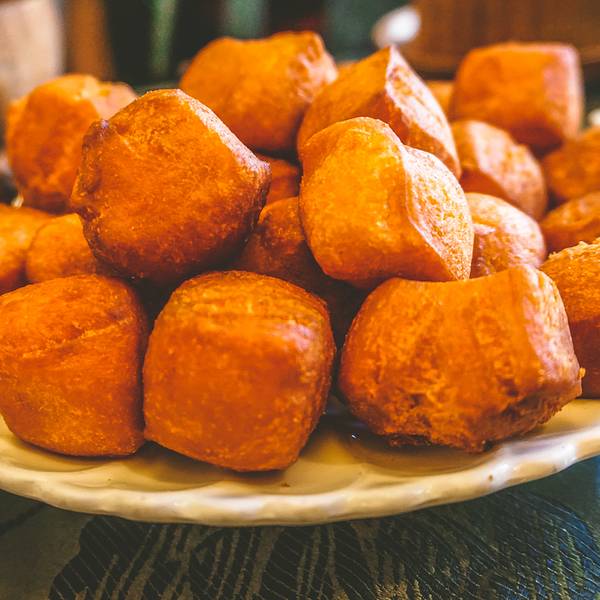 古朴的门厅里飘荡着淡淡的奶香,一下子唤醒了仍困在朦胧睡意中的我,仔细打量,餐厅里的各种布置都带有蒙古族特色元素,浓浓的草原风情迎面而来。这里的锅茶极为正宗,服务员会在现场将炒米、肉干、奶皮儿在锅中翻炒,随后再加入牛奶和砖茶共同熬制,在时间的催化下,一大锅香醇浓郁的奶茶就备好了。之前的经历让我知道,内蒙的酸奶口感极佳,不像西藏的酸奶那般猛烈,而是温润中带点青涩,特别是混上一勺微微焦香的炒米,那美好的滋味令人难忘。就让这碗酸奶,开启元气满满的一天吧。大列巴,当地早餐的经典食物,面包松软,配以香甜可口的蓝莓果酱,吃一口都会露出幸福的微笑。一份小小的烤牛排,尽管已是分装好,但口感依旧紧实耐嚼。最让我稀罕的是这些“果子”,感觉是我们中原地区Mini版的油炸糕点,色泽诱人,口感微甜,也许是在制作过程中混入了牛奶吧。但最地道的吃法是,把果子泡在奶茶里,两者的完美搭配激发出奇妙的鲜香。最不能错过的主食是布里亚特包子,热腾腾的,牛肉馅儿,非常香!咬一口能看到泛着油光的汁水,随之而来的是温煦的香气,非常天然,不像很多馅料那样完全靠各种调味品、香料混兑而成。