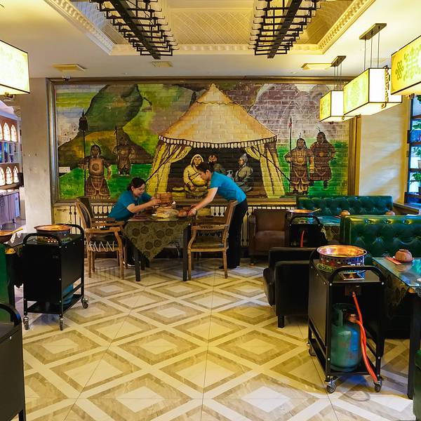 - 这家位于华联商厦边,进门引位直接下到地下,点菜得在大堂看图说话,强烈推荐锅茶和手把肉