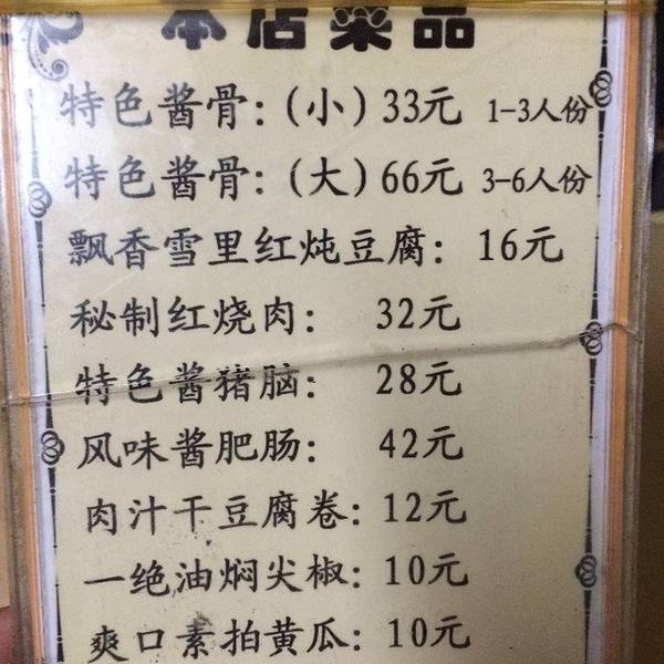 父亲节,想选他曾经可能喜欢的老口味给他惊喜。先是去了老店,结果不许打包,我就去了新店。菜单:大骨棒8块;雪里红炖豆腐;酱肥肠;拔丝地瓜;还有什么忘记了,一共是8个菜;到家的时候稍微冷了,虽然很好吃,但是没有想象中的那么好吃。可能是小有名气就期望值太高了吧。没觉得什么地方特别。而且鼓棒最多能打包2分,一般都只给打包一份。老板很热情,能刷卡,慕名来吃的人确实很多。算是经济实惠量又足了。