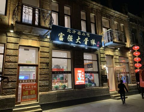 闻名道外的哈尔滨名片。 【位置】原来富强大骨棒道外一共两家店,离得不远,现在只剩下风情街上一家了,很好找。 【环境】其实店面不大,大厅不到二十张桌子,饭点来店做好等台的准备。 【味道】很有性格的店,一共就前台上的12道菜,卤酱菜为主。一小份骨头是四块,骨髓可以用吸管。标准的东北酱大骨,不过个头着实很大,雪里红炖豆腐地道的东北菜,家里的味道。