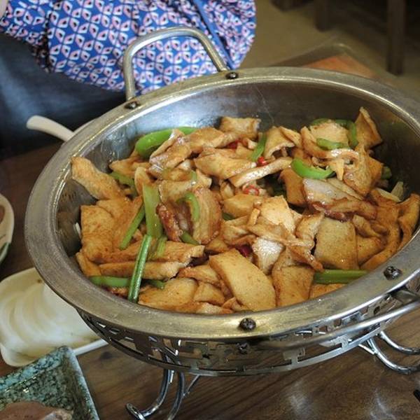 来到哈尔滨的第三天了,今天的午餐是毛毛熏肉大饼,这是早就订好了的餐食,还买了团购券儿,饭店的地址就在中央大街辐射出的大安街的中部,很容易就找到了。他家的当家品种是熏肉大饼。我们的套餐里还有一道干锅...来到哈尔滨的第三天了,今天的午餐是毛毛熏肉大饼,这是早就订好了的餐食,还买了团购券儿,饭店的地址就在中央大街辐射出的大安街的中部,很容易就找到了。他家的当家品种是熏肉大饼。我们的套餐里还有一道干锅千页豆腐:30元。这应该算是一道很素的荤菜,一锅的食材里,只有三五片切得薄薄的五花肉片儿,不过菜量挺大的,两人吃还真有点费劲呢。千页豆腐,我们头一次听说,后来查了一下,得知:千页豆腐是素食 新产品,广泛流行于大陆的沿海城市及北方地区。它采用台湾的最新豆腐制作工艺,以大豆粉及淀粉为主要材料精制而成,是一种富含蛋白质的新世纪美食,它不仅保持了豆腐原本的细嫩,更具备特有的Q劲和爽脆,还具有超强的汤汁吸收能力,配合现代厨艺,可以做出高品质的新时尚美味佳肴来。看来此言不虚呀。这份干锅里的主要食材还真的滑嫩细腻,脆爽劲道,滑溜溜的,还很入味,口感不错。这家菜馆和其他东北菜馆一样:菜量很大。我们觉得这是一家挺好的东北菜馆,可以来尝尝。