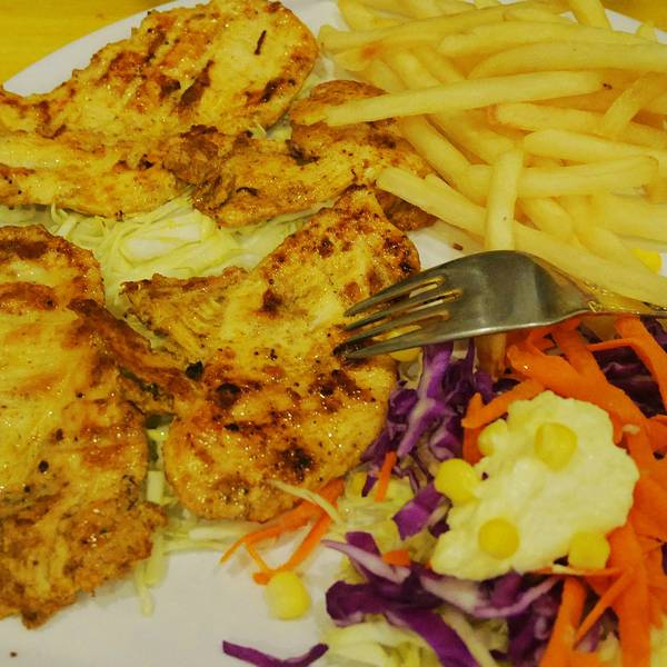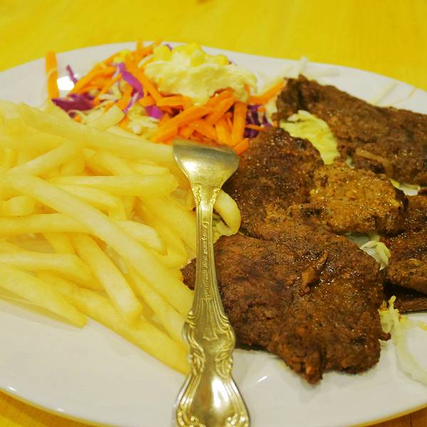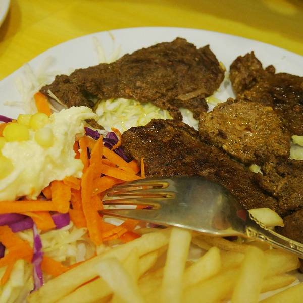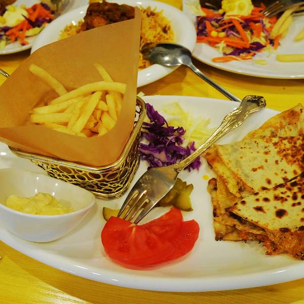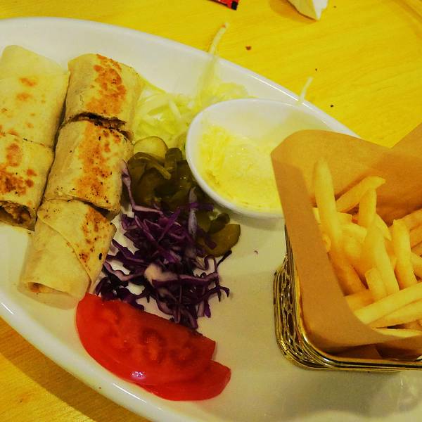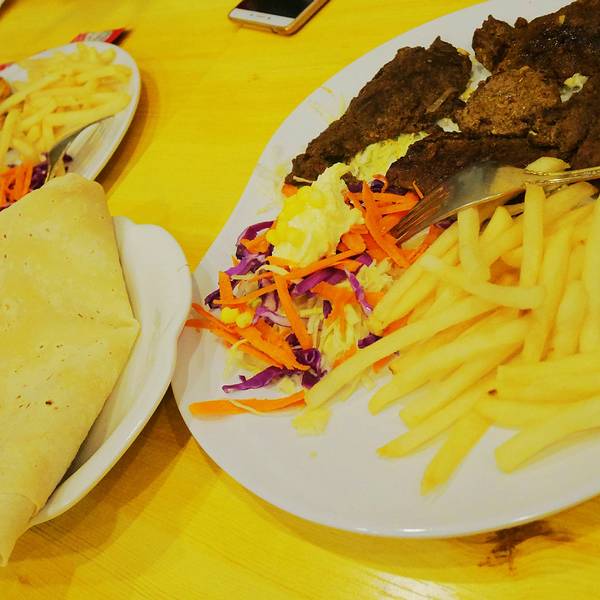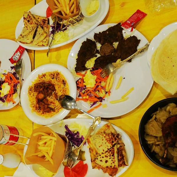 这家位于汉广街跟桥南街交口,总体来说还是在汉广街,哈特旁边咖啡馆一条街走到头右拐就是,开了好多年,以前是家有些风格的小店,如今装修之后整体风格有点类似快餐店,不过总的来说干净了许多。离工大很近,可以坐公交车64,94路在哈特下车,然后步行500米左右过去,或者地铁沿线就坐地铁在工大下车,也很方便过马路就快到了。 环境其实很整洁,因为新装修过,桌椅都很干净,水烟袋也都不见了,半地下室,只有一个大屋子。赶上周末人很多,有些包着头巾的阿拉伯人,谁让这家是中东料理来着,看来是很地道了。 单价不太便宜,基本都是主食类的套餐,39起跳,想吃饱就要人均50以上,还是人多划算,可以多点几种吃的。学生证打八折,团购有八五折,所以有学生证很划算。 强烈推荐大叙卡,我们5个人点了四份,其实分量不大,所以导致吃的有点多。有两种口味,鸡肉跟牛肉的,推荐牛肉的,鸡肉的有点一般了,第一份可以点套餐,39一份,有薯条,大叙卡是一种饼,里面加了芝士跟牛肉,煎熟之后蘸奶油,还有配菜,第二份想要加单的话可以单点叙卡,不要套餐,20一份,薯条基本每个套餐里都有,到最后有5.6份薯条吃不下。 鸡肉土豆,这个推荐,土豆很软烂入味,鸡肉外皮感觉是烘烤过的,但是里面还是脱骨的,39一份可以当做主菜 烤牛肉,有点柴,49一份,肉不多,混合在饼里还不错,不过还是没有叙卡好吃 红米饭,这个有点一般,上面的酱汁还不错,感觉是咖喱饭配鸡肉秘制酱,价格39,能吃饱。除了这些还有汉堡,也很推荐,可惜人多没办法分食。总体来说是个不错的有特色的饭店,每个套餐还会送一份饮料,性价比还是不错的。门口是这样的里面的桌子基本这两种,边上的独立作为跟小方桌,里面还有两张方桌拼的。简洁风格部分菜单灯很特别烤鸡肉,鸡肉有点柴,沙拉还不错烤鸡肉烤牛肉红米饭鸡肉土豆,是个手枪鸡腿鸡肉叙卡,这个叙卡是变成了卷饼,旁边的蘸料好吃鸡肉叙卡最爱的牛肉大叙卡烤牛肉烤牛肉单份叙卡卷饼,这个配牛肉的全景一部分
