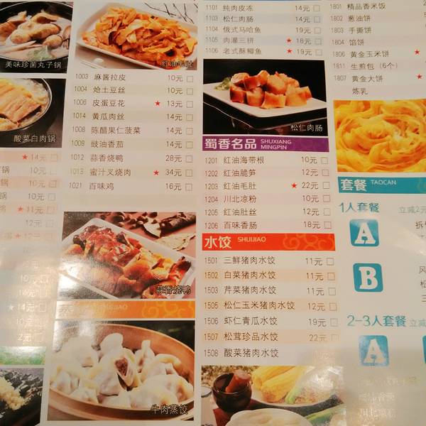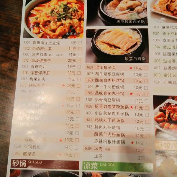 砂锅 葱油饼 拆骨肉豆腐锅 黄金大饼 草帽饼 狮子头砂锅 三鲜饺子 粉肠 坛肉 饺子 蒸饺 酸菜羊肉锅 土豆丝 土豆泥 驴肉蒸饺 沙锅 酸菜白肉锅 丹麦大饼 松花鸡腿 手撕餅 炝土豆丝 酥鲫鱼 红油毛肚 牛肉蒸饺