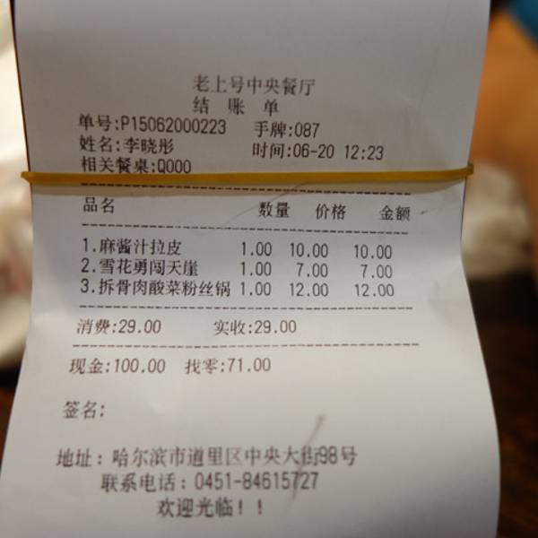 这家从大学就常吃,那时候火到不行,各种排队,当时的规模是整个楼都是他家,现在改的有点类似快餐。一楼有外卖窗口。老板是本地餐饮协会主席,跟刘一锅是一家,一个名副其实的老字号。 地理位置很好,在中央大街的大安商厦楼上,旁边以前是德克士,现在改成了汉堡王,也就这家屹立不倒。面积很大,外面看着小,其实里面一个超级大的大厅。 服务也是很招牌的,很一般,爱理不理是常态,二楼窗口点餐付钱,然后自己找座椅,店员神奇的能找到你的位置,跟大多数咖啡馆一样,其实是拿着个号牌。菜价不贵,在中央大街寸土寸金的地方,已经算是不错的。客流量很大,不过差别是,以前都是本地人在吃,现在满眼的游客,人均30就差不多。 交通方式很多,64路可以坐到七道街下车,20路,116路可以在道里松雷下车,徒步过去都不到300米。 环境吧,比较普通,二楼餐台附近的座椅还好,楼上灯光太暗,座椅又太拥挤,感觉没那么舒服。 特色菜吧,作为吃了十几年的饭店,我只想说,味道真的比以前差太多。之前的特色是丹麦大饼,手抓饼跟葱油饼。砂锅部分也换了好多遍味道,之前最好吃的是拆骨肉豆腐,小菜也变化很大。 美味真菌丸子锅,砂锅,现做的,14一份,丸子部分有点失望,味道一般,一股子鸡精味。 手撕饼,还不错5块,因为是一个人吃,所以不方便点丹麦大饼,那个其实很有性价比,味道也不错,芝麻很香。 豉油茄子,还不错,因为看到别桌都点,于是点来试试,总体来说没失望。手撕饼这纹理,真是不错豉油茄子,分量不小,一个人吃又点多人均消费刚好30菜单菜单菜单 蒸饺有点慢,但是味道也还不错