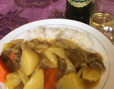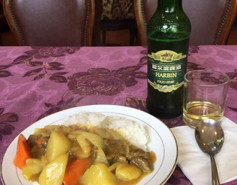 座落在快走到松花江的中央大街上 墨绿色的大门 几乎被掩盖在墙上的藤蔓里 真是非常浪漫的小店 店内的装修很“俄式” 充满了怀旧的氛围 牆上掛滿了哈爾濱的歷史與文化 銀屏上反覆播放懸崖的片段 該劇就是在此取景的 簡單的午餐 簡單的咖哩牛肉飯 加一瓶1900 哈啤 牛肉塊完美的搭配馬鈴薯 紅蘿蔔 洋蔥 咖哩的味道很地道 米飯很糯很熱 吃的很過癮 在這樣一個文青氛圍裡用餐 感謝的是主人保存文物的用心 我很滿意~