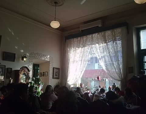 餐厅面积不大,基本上就一个大屋子坐的满满的,门口还都是排队的人,赶上过年去吃,排了10多号,等了快一个小时。所以推荐别周末别节假日,要赶上节假日就早点去吃。屋子里的类似壁炉的墙面窗帘也很复古门,绿色透明的,下午有阳光的时候很美店里搜藏的老相机,旁轴,双反,折叠都有这是牛货,康泰时,很高级看不太懂的机器,上面那个侧面装胶片的好像很牛老式折叠相i机,这里竟然像一个相机博物馆老照片茶叶罐子都这么有历史,建筑就是古董西餐馆红酒酒杯子都这么美午后的阳光,密密的桌子壁画红汤盘子有点脏,味道还不错冰淇淋,普通油炸包,里面有馅料有点凉了,味道就觉得普通了,没莉莉娅的好吃土豆泥,这个棒,奶油煮土豆泥,上面加了黑胡椒酱,虽然卖相普通,但是味道真的很棒,价格不贵20多块牛肉还是猪肉饼,还不错,这个不贵外面的门口,阳光正好,真心特别美。