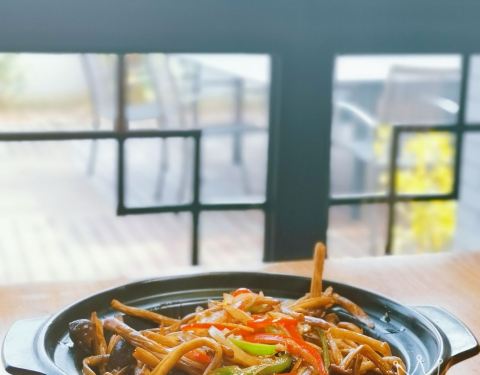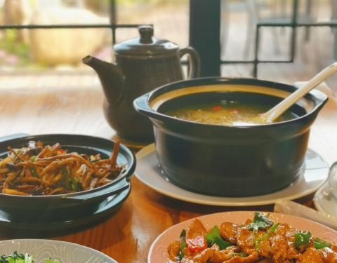 山中美味,来自安吉农家味道。都是山中的好味道,与城中那些完全不一样,吃的就是原汁原味。 [环境]木质古色古香的雕花木门,玻璃窗外一览庭院美景。店家结合安吉特有的竹融入装修设计里面,别致的竹灯、竹椅,还有特制的房梁无比体现老板对于好好生活的追求。 ⭕|农家土鸡煲^来着安吉走地鸡,经过2小时以上的熬制,鸡汤鲜美正是冬季进补好味道。鸡的肉质都炖的酥嫩,就放了一点盐,搭配枸杞,喝着暖暖的。 ⭕|干锅茶树菇^来着山中美味,烧的入味好吃,一个字“鲜”非常下饭。 ⭕|清炒肉片^猪肉的滑嫩,搭配青椒洋葱,都是当地自产的土猪肉,和城市味道完全不一样。 ⭕|香菇青菜^健康的味道,青菜都是当天新鲜采摘的。 一顿原汁原味山中美味,坐看山中美景,品鉴好吃的味道。