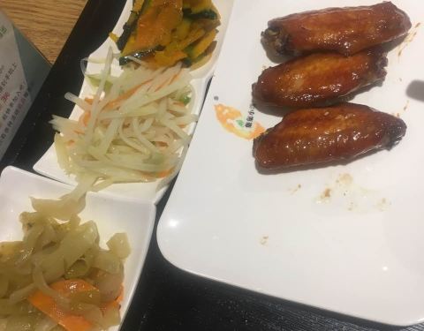 总体来说还行,鸡翅是甜的,猪排挺辣的,绿豆汤挺淡的