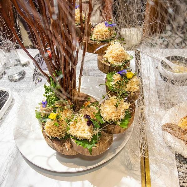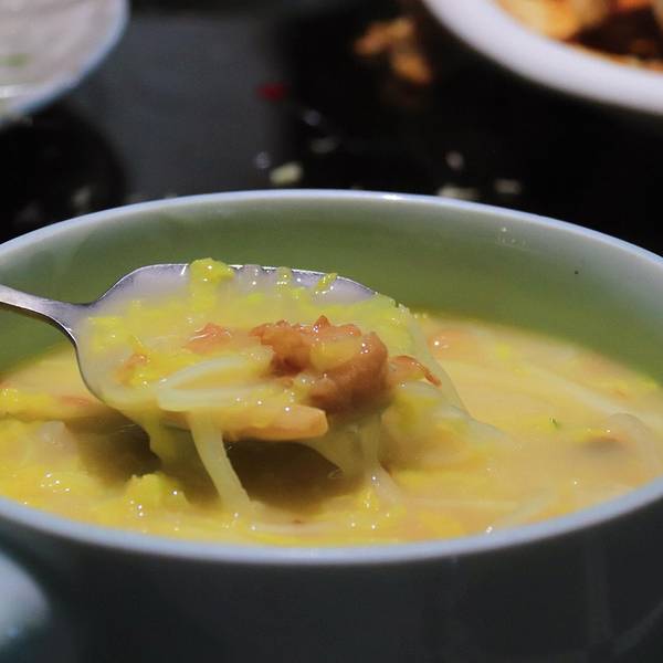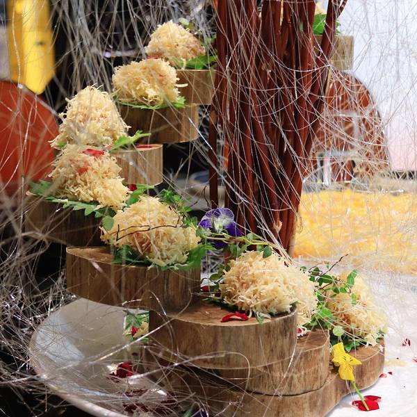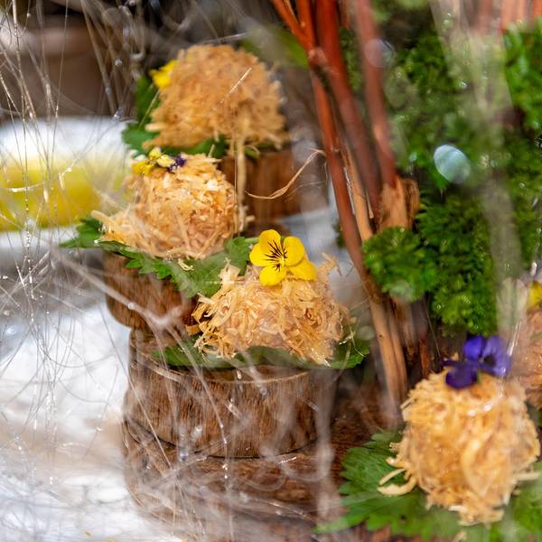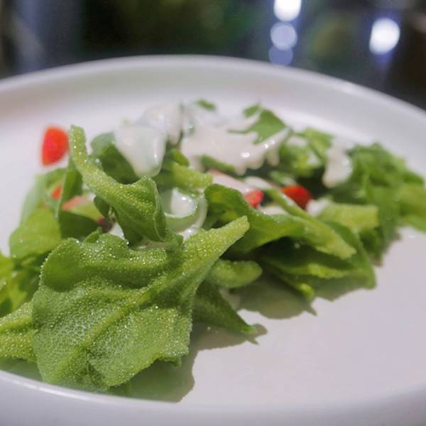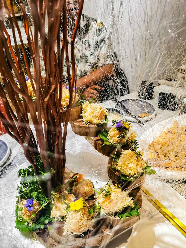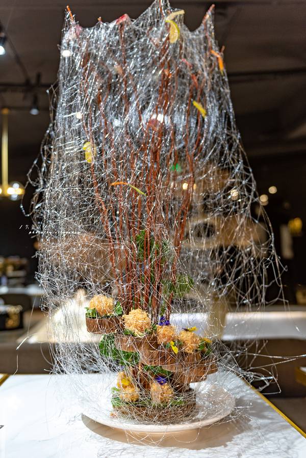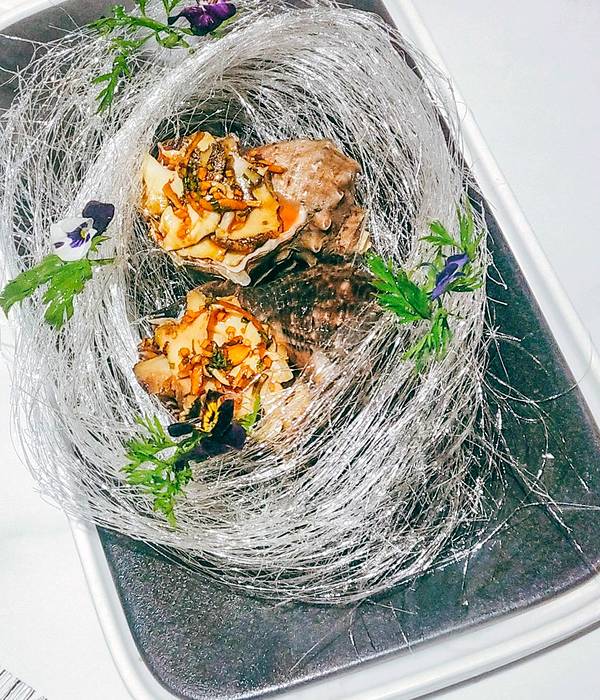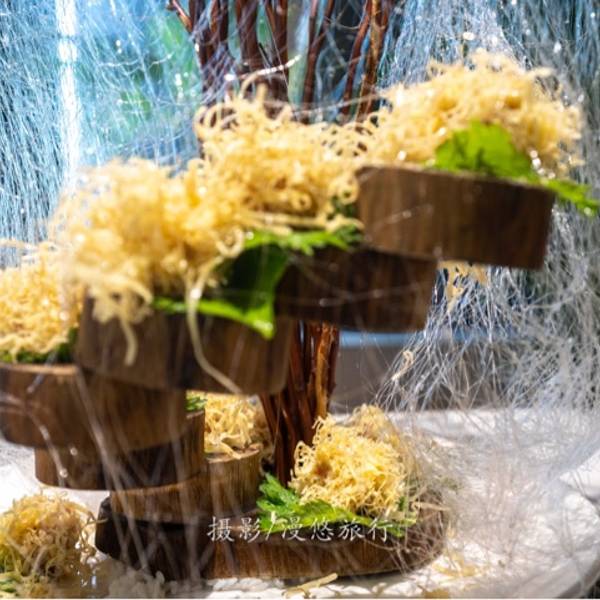 这道菜太对我胃口了,颜值和口味都在线!最外面一层是透明的糖丝,鸟巢似的椰丝包裹中的就是虾球,轻轻咬一口,带着适中芥末味的虾球Q弹鲜嫩,太美味了!当然这道菜个人觉得还可以再优化一下,比如让牛油果的味道也凸显出来,这样口感层次可能就更加丰富!(注意了,吃这道菜的时候要注意,糖丝随时都在融化,小心粘到头发和手上!)