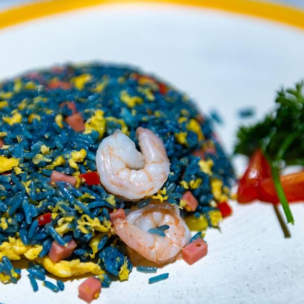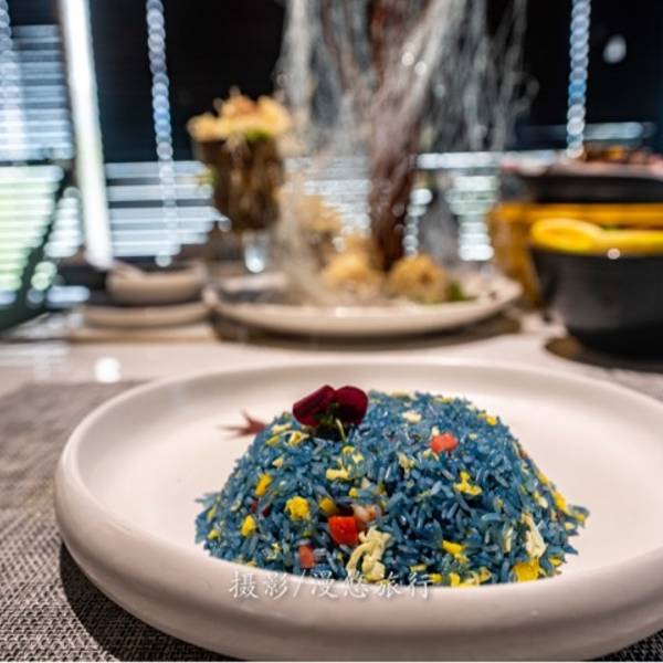 地狱脆皮文昌鸡:被关在笼子里的文昌鸡,外酥里嫩,鲜美多汁,不愧等到最后才吃到的压轴菜。金沙蒜香排骨:蒜末全部是过油炸过的,焦香味儿十足。蓝色海洋炒饭:用蝶豆花的天然染色,蓝色米饭和虾仁的完美结合,鲜花做摆盘,很像一个精致的艺术品。橄榄油炒鸡腿菇:鸡腿菇鲜嫩可口,非常爽口。番茄土豆排骨汤:吃了很多肉肉喝一口番茄汤,味道酸甜可口。店铺名称:稍微秀创意品味餐厅(三亚湾店)