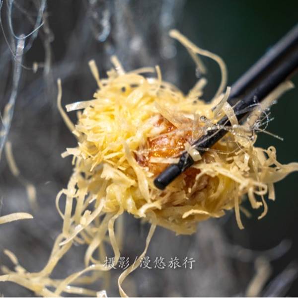 ...形象,然后海螺切成一片一片的,仿佛是嗷嗷待哺的小鸟宝宝放在糖丝里,海螺肉很紧实,酸辣的口感更棒