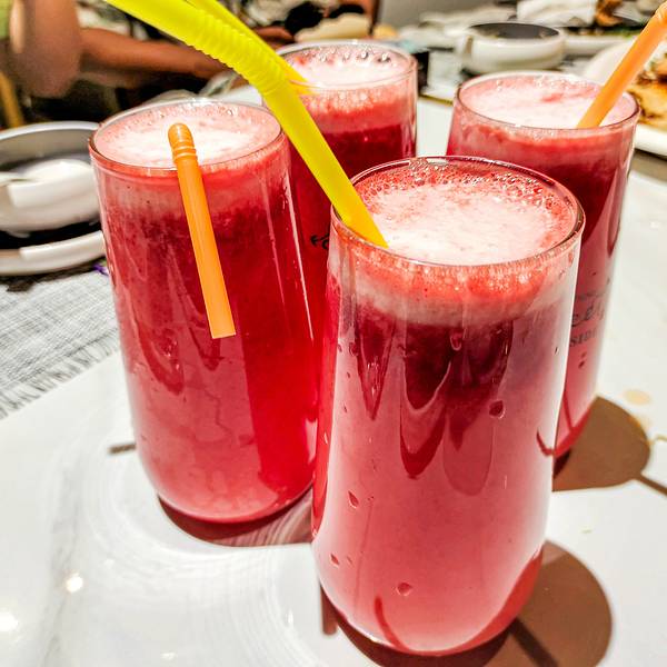饭后甜点可以点番茄脆果沙拉,一颗一颗小小的红色小番茄,红彤彤的被端上来,装盘很时尚的感觉,迫不及待咬一口,里面居然有核桃仁,这是怎样的神仙享受,还是自己去体会吧~对了,别忘记点一杯西瓜汁哦,别小看这看似普通的西瓜汁,里面其实加了料,在三亚这种热带地方,能喝到这样一杯西瓜汁,真的超级解暑降温。小贴士: