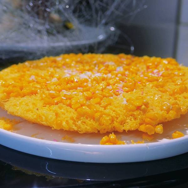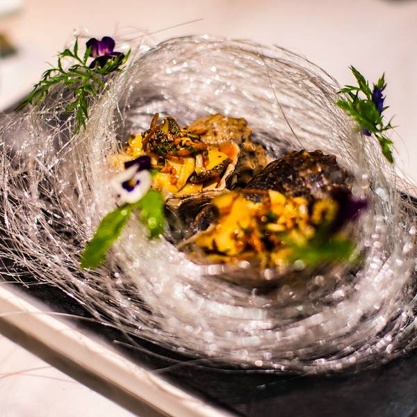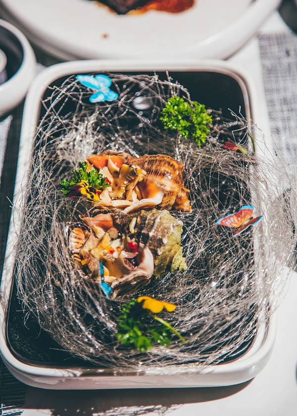 这一颗颗金色的虾球好诱人,外面炸成金色,咬一口,里面香嫩,外面酥脆,殿堂级的味觉享受啊。虾球吃完也可以把这些糖丝也吃掉,如果还有胃的话。还有一道菜也有糖丝,就是拉丝米椒海螺,这是用糖丝做成了一个鸟巢的形象,然后海螺切成一片一片的,仿佛是嗷嗷待哺的小鸟宝宝放在糖丝里,海螺肉很紧实,酸辣的口感更棒。