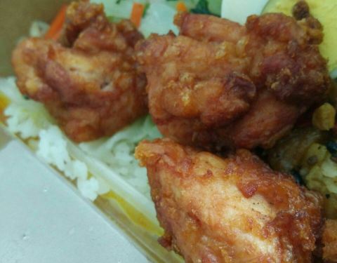 第一次订的套餐,一个饭一个堡, 结果送来两个饭。 饭的分量不少,原订的饭还剩了, 以饭顶堡的那份少些也还是剩了, 因为菜量太少了,不足以送饭。 一点“青菜”,看不清是啥, 虽然味道不算好,两口就吃完了。 太想念青菜了! 一份的鸡扒倒是不少,大块头,味道也不错。 充堡的那份放了三个鸡翅根,辣的,没法吃。 两份饭都有半个卤蛋, 正宗的那份配小盒酱料,味挺好。 另外那份配大盒不知啥味的酱料,不合口。