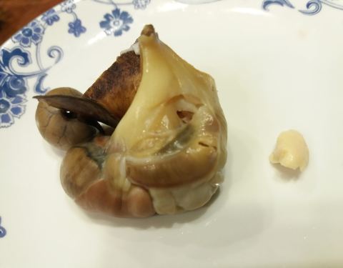 1、大连当地的朋友带我去的这家酒家,吃下来,感觉还行吧,但是价格也不便宜,人均居然也要169元(不含酒水)。 2、在光彩酒家吃到了一样新东西,说新也不新,只是别处,或者说南方,包括大部分北方也许吃不到吧。大概只有大连能够吃到的一种主食——韭菜盒,不是普通的韭菜盒,而是加入海参的韭菜盒。单价也不算贵,每只4元,个头也不小,毕竟加入海参的。 3、在光彩酒家就餐的过程中长知识了——吃海螺去脑。吃海螺不去脑容易中毒而头晕,曾经有一说法,就是7只海螺脑子能毒死一头牛, 4、海螺的头部内有大连人俗话说的“脑子”,特征是黄色的米粒状,要在吃前取出。方法是,用筷子将其挑出来,当然,如果海螺比较小,就不用取出来了,但是大量吃的话,还是要取出来,不然容易头晕,吃海螺去脑,也就是大连话“拿脑子”。