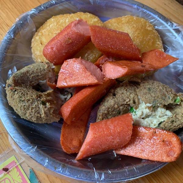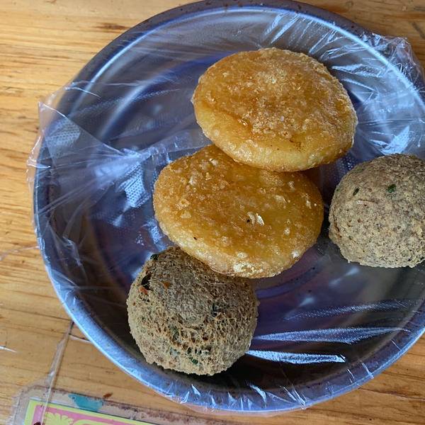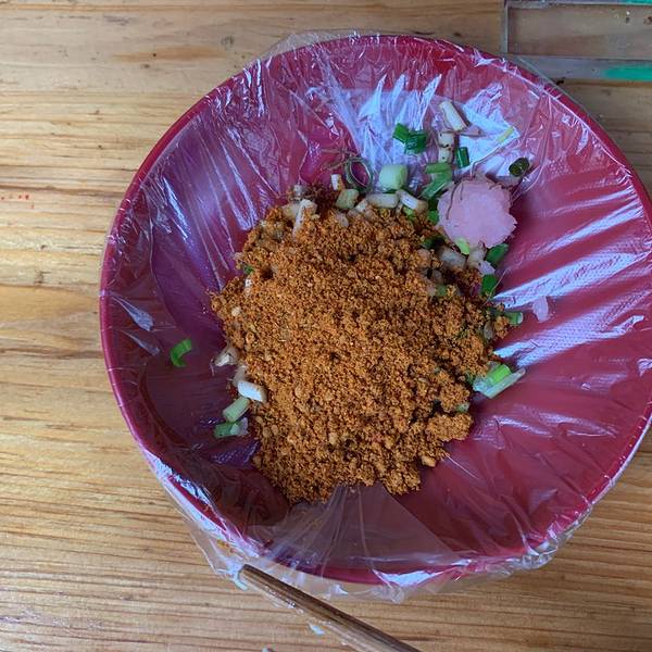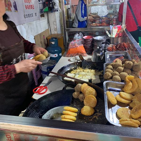 来到名称遵义,除了参观红色景点以外,就是吃吃吃。在距离遵义第一大景点——遵义会议会址200米处就是遵义的步行街,里面的美食店更是藏龙卧虎,各有各的特色。 在一处小巷中发现一家油炸洋芋粑的生意特别好,小摊虽然不大,三边以条凳围桌,但是一直没有空位,食客一批接着一批,好不热闹。观察了2分钟后,果断上前点了洋芋粑、豆腐圆子和小朋友最爱的火腿肠等。 老板娴熟地将刚炒好的洋芋粑夹道盘子里,并询问要蘸水辣椒碟还是辣椒面,第一次吃不好区别,索性向老板同时要了以上两个蘸碟。辣椒蘸碟内不仅是五香辣椒面,还有泡萝卜丁和葱花。 第一口洋芋粑就惊艳到我了。外皮非常地脆香,比贵阳的洋芋粑强N倍!印证了那句话,虽然个头不大,但是浓缩的都是精华。 从小孩的口中抢下几段火腿肠,同样是焦香脆爽,怪不得小孩不愿给…… 结账21元,性价比不错!