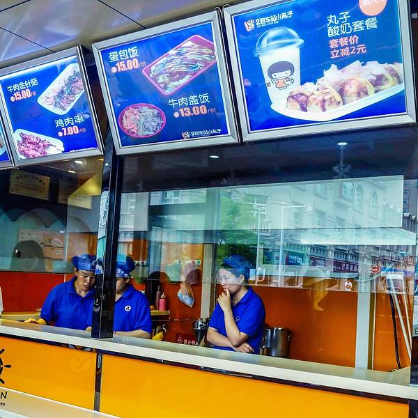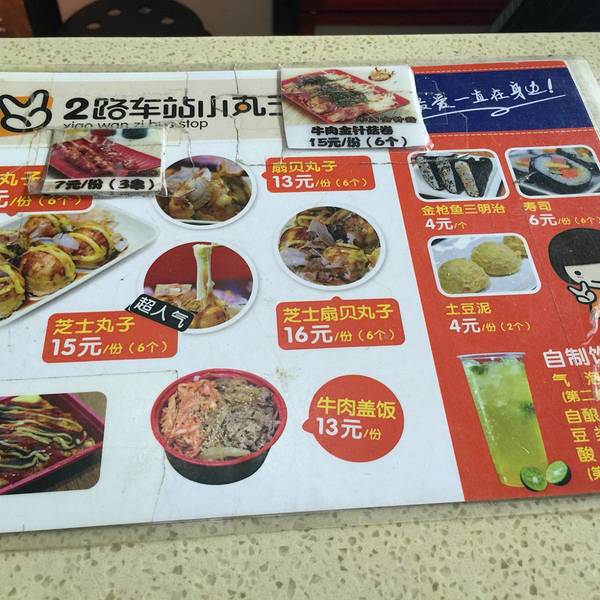 点了一份芝士味的,果然国内的章鱼小丸子都是章鱼一小块淀粉一大坨,芝士味还是比较浓郁的,作为下午茶小食还算不错啦~~~▲居然还卖盖饭▲一...▷2路车站小丸子纯属路过,既然是大连的网红小吃,自然不能轻易放过。