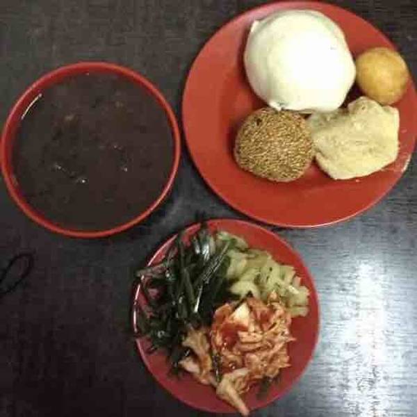 还是那个小门面,但是品种多了不少,红豆粥一碗浓香绵蜜,满满的一碗红豆沙真给力,麻团炸元宵各一个,小伙伴还点了掉渣豆包,里面也是满满的红豆馅,都可以用勺子挖着吃!小菜2块一盘太超值了!