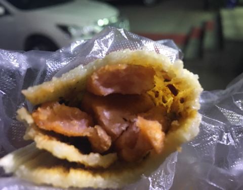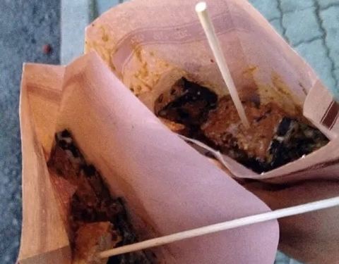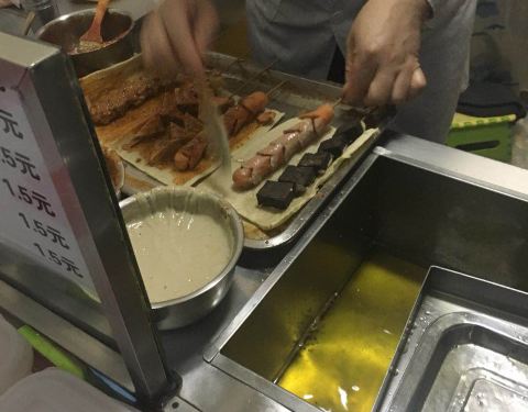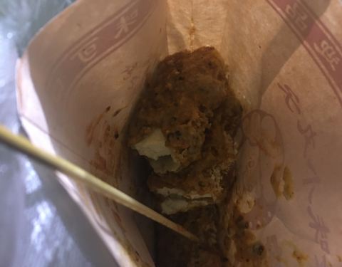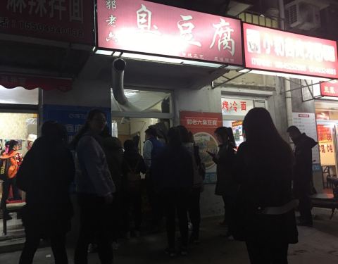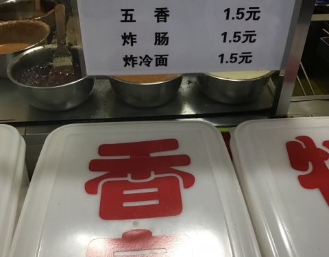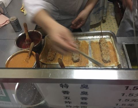 临时铁皮房子,老板夫妇都穿戴整洁,锅里的油看起来也清透,好多学生来光顾,一共4种口味,清臭大臭五香特臭,一样来一个尝尝,五香的能算有些特色吧,脆皮的,其他的和别人家都一样呀,只是卫生情况让人比较放心; 学生们都喜欢顺便炸一个冷面用来包臭豆腐,似乎是标配了; 矫情一下,我还是更喜欢长沙那种灌汤臭豆腐,而不是这种刷臭酱的,求之不得,辗转反侧~