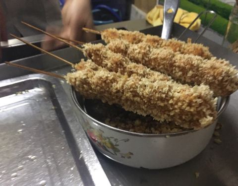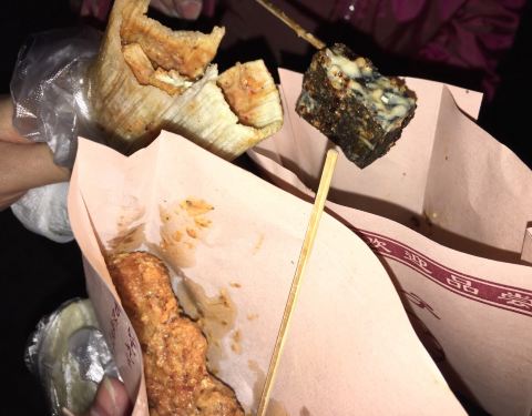好朋友先去品尝,又一起去吃,本人对臭豆腐没有那么热衷,去西塘吃的臭豆腐感觉还不错,大连的臭豆腐是抹臭豆腐酱,有点偏咸。这家臭豆腐听说是网红店,去到果然人很多,有特臭,大臭,香臭,五香四种选择,我选了大臭,臭豆腐是黑色的,吃起来挺香,还买了炸冷面的炸肠,一共4.5元,很实惠