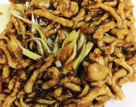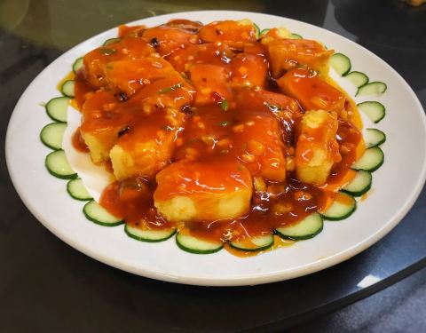 天津路牌单双号不太对称 地址也近洛阳道 餐厅简装 几张四台 还有一张圆桌 客满 食客们必点的肘子 慕名而来 (预制再上锅蒸熟) 略等落座 上菜快 必点的还有圆白菜(=洋白菜?)酱味略甜;孜然羊肉(肉粒裹浆炸过配洋葱粒)尚好;鱼香肉丝酸辣刚好(配的是青椒谷萝卜丝)