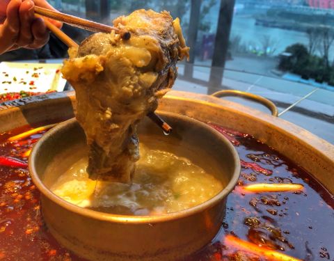2019年3月某天,从弹子石老街逛完,找到这么一家环境比较好,好像也是必吃榜的餐厅~~ 餐厅环境属于现代轻奢风~餐厅人不多,给我们两个人一个大圆桌,靠近窗边,能看到江景~ 点鸳鸯锅会被重庆人笑话,但是我们怕太辣肠胃受不了,还是选了大骨鸳鸯锅~~ 一定要点耗儿鱼,其他就随意搭配了酥肉、虾滑、牛羊肉、鸭血、海带芽、豆干等~~