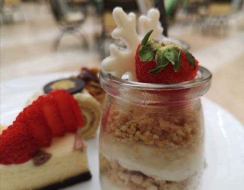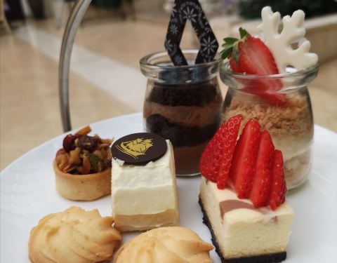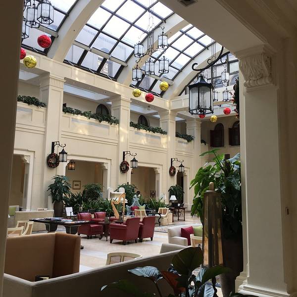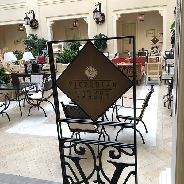 维多利亚大堂吧,是一家环境优美的咖啡厅。挑高的穹顶,可以看到外面的蓝天,和煦的阳光斜照在繁茂的植物上、富有英伦风情的餐桌上、人的笑脸上,光影斑驳,远远看着就特别特别舒服;吧内左右的长廊摆放了许多书画作为展览,喝下午茶的时候会有小提琴乐队在大堂中央进行优雅的演奏,很是优美。布朗尼特别好吃,巧克力很浓郁。 甜点多到吃不完,咖啡是现磨的,味道非常不错。餐具闪亮亮,刀叉和勺子都是银的,环境好美,屋顶是玻璃的,有喷泉和绿植。
