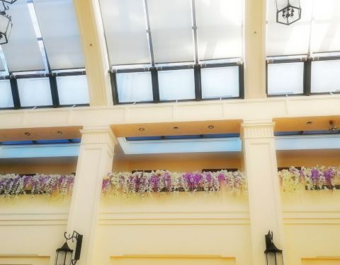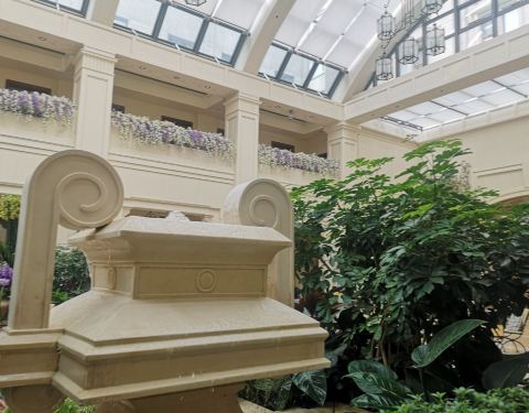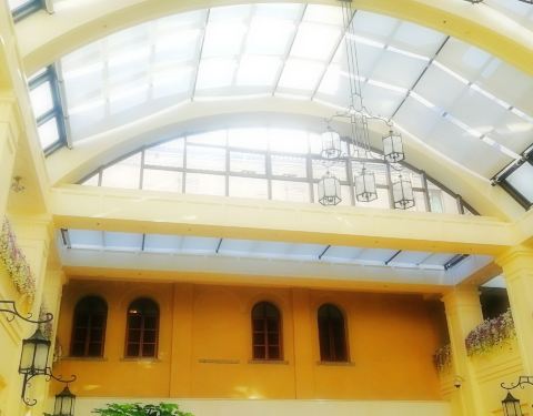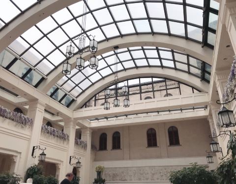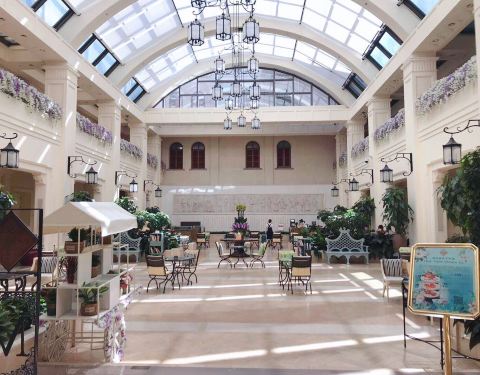 百年酒店内的咖啡厅,玻璃穹顶敞亮大气。
